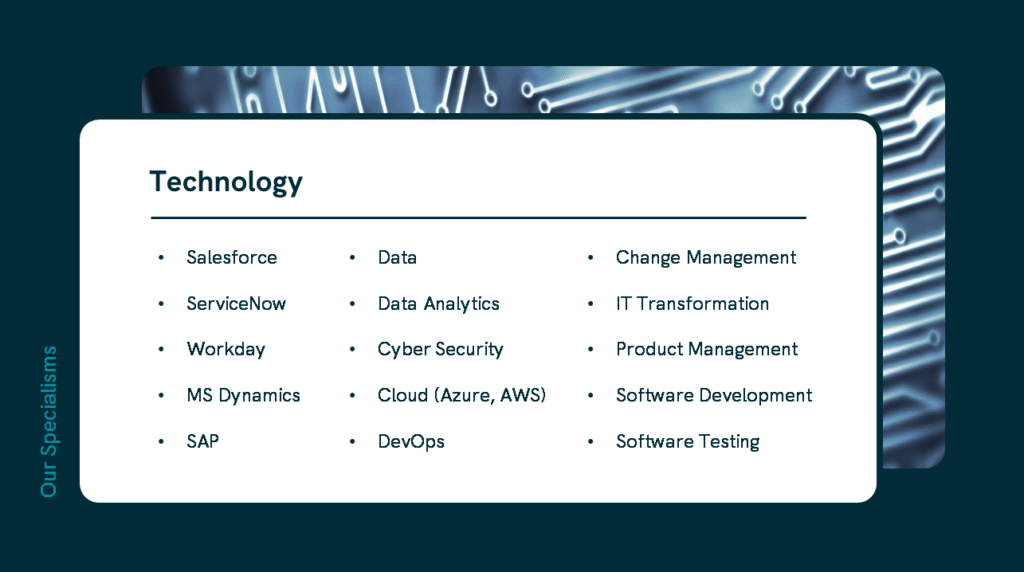 When you work with us, you’ll receive confidential advice, guidance, market intelligence, and support when you need it – as well as the most comprehensive range of Technology opportunities on the market.